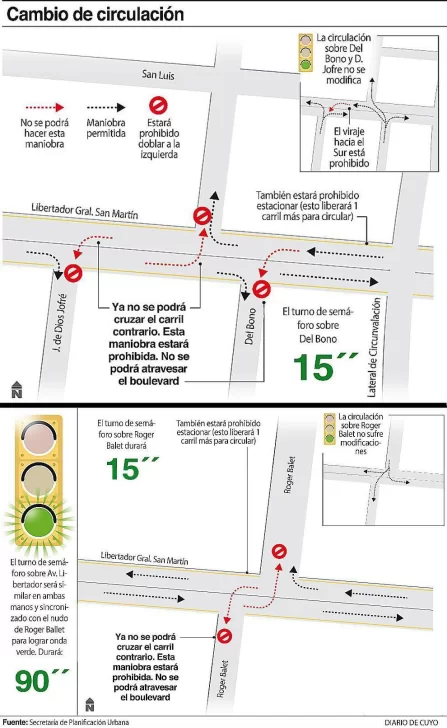 Aunque todavía no está definido el día, se estima que a fin de semana, los autos que circulen de Este a Oeste ya no podrán doblar al Sur por Del Bono. Tampoco podrán hacerlo los que vayan de Oeste a Este hacia la calle Juan de Dios Jofré (ver infografía). Esto será posible porque sólo habrá dos cambios de paso en los semáforos. Ahora hay cuatro. Lo mismo sucederá en la otra esquina, en la intersección de Libertador y Roger Ballet, donde también se produce caos vehicular. Lo que se busca es, además, que los autos que desde la Circunvalación quieran ingresar a Libertador, no formen largas filas tal como sucede en la actualidad.