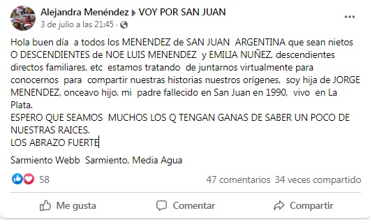 Hace poco en Facebook, inició una campaña buscando a los Menéndez que vivan en San Juan. La mujer, expresa que recibió muchos comentarios, que pudo dar con una prima María Luisa -hija de Noé- y gracias a ella pudo conocer que todos sus tíos están fallecidos. "La misión ahora es dar con todos los Menéndez de mi generación, con mis primos hermanos, se que muchos pueden haber fallecido pero sería muy lindo poder saber de ellos o de los hijos de mis primos", manifestó.