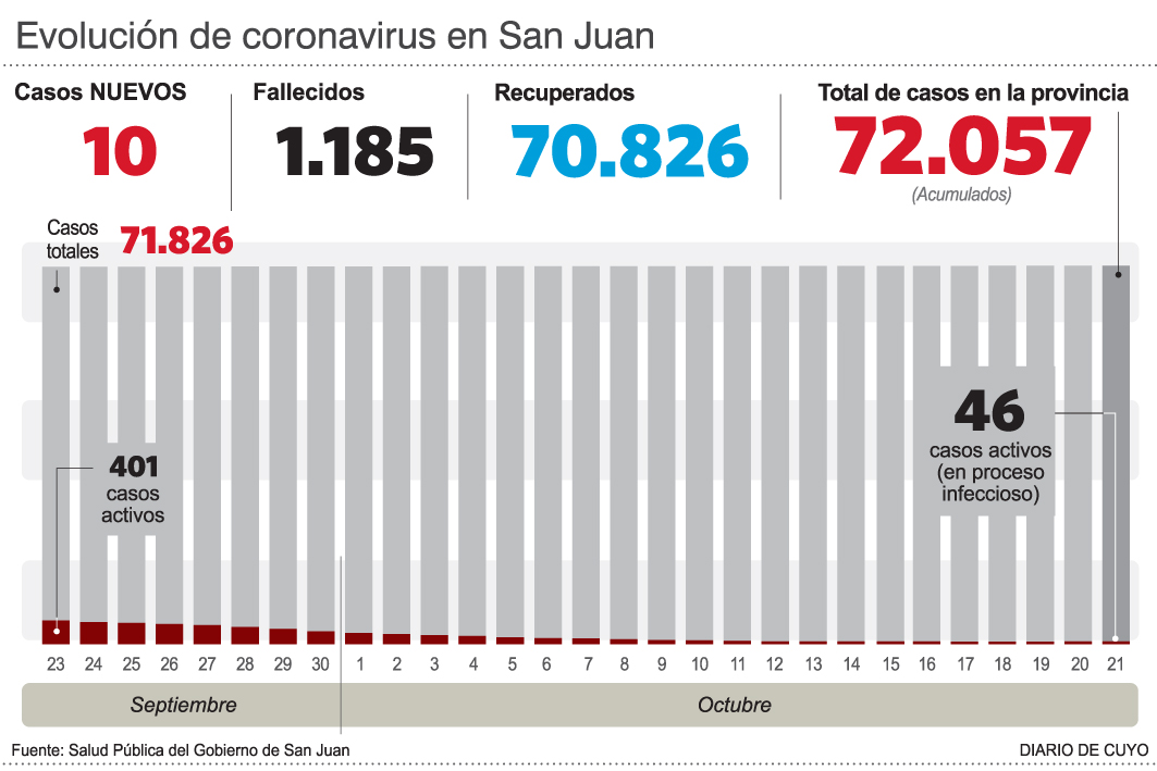 De esta manera, el acumulado de personas infectadas en pandemia se eleva a 72.057. De todos ellos, el total de casos activos no llega ni al medio centenar. Puntualmente en San Juan hay 46 individuos con proceso infeccioso en curso, según datos oficiales.