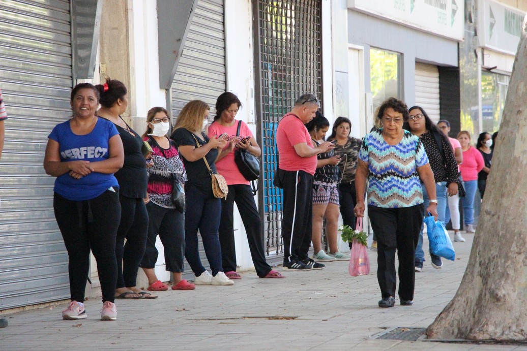 Un cuello de botella que generó un caos en los cajeros automáticos. Colas de hasta 400 metros (con la separación de 1,5 metros, en algunos casos). Eso, además, hizo que el volumen de gente moviéndose por las inmediaciones de esos cajeros sea mayúsculo porque muchas aprovecharon para de paso hacer compras.