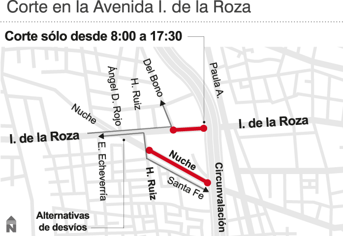 El funcionario agregó que por el momento sólo hay corte total en calle Nuche, entre Lateral Oeste de Circunvalación y Hermógenes Ruiz, por el entubado del canal, que se mantendrá por unos 20 días más. Luego, la interrupción del tránsito se trasladará a calle Nuche, entre Hermógenes Ruiz e Ignacio de la Roza, para continuar con esta parte de la obra.