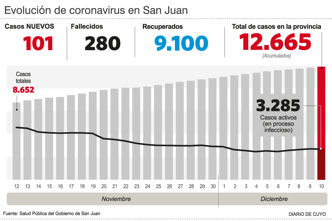 A su vez, hubo 101 casos detectados, para elevar el acumulado a 12.665 positivos, de los cuales 3.285 atraviesan procesos infecciosos. Hay 9.100 recuperados y 86 pacientes internados en áreas críticas.