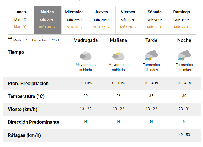 Se espera para lo que resta de la semana máximas que oscilarán entre los 27 y 31 grados, predominando la presencia de tormentas, viento sur y cielo nublado.