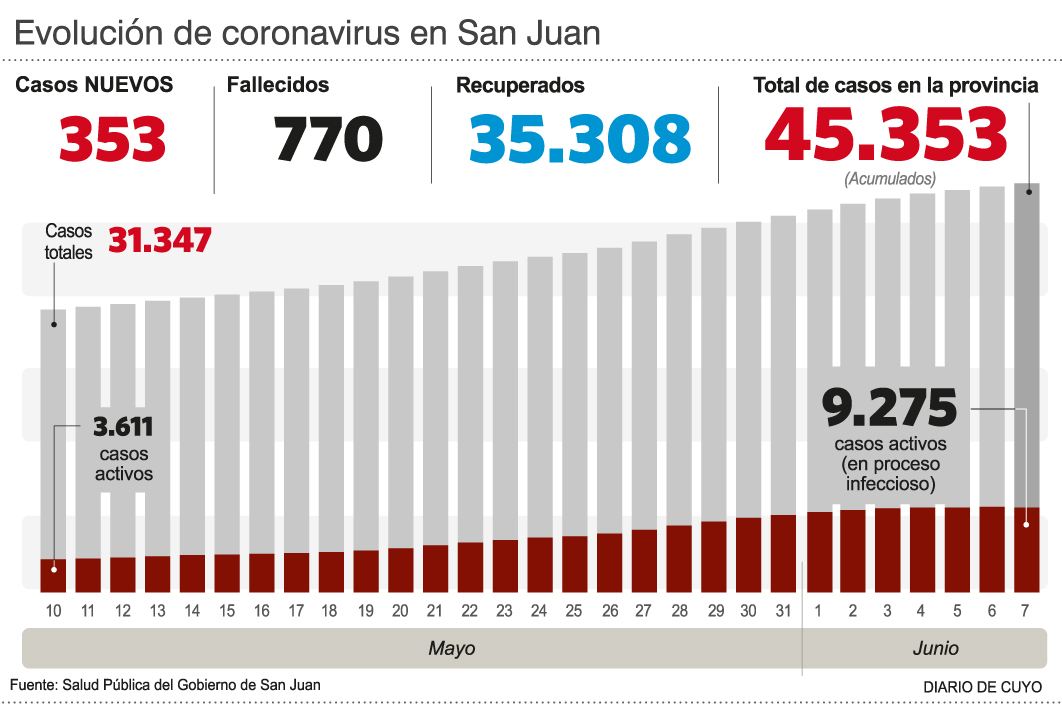 El Ministerio de Salud Pública reportó ayer nueve decesos y otra vez hubo una persona joven. Se trata de un hombre de apenas 29 años, que vivía en Jáchal y estaba internado en Clínica El Castaño. De esta manera, el total de decesos en pandemia asciende a 770. En cuanto a los casos, hubo 353 ayer, para un acumulado de 45.353 infectados. De ellos, 9.275 son casos activos, con 302 internados.