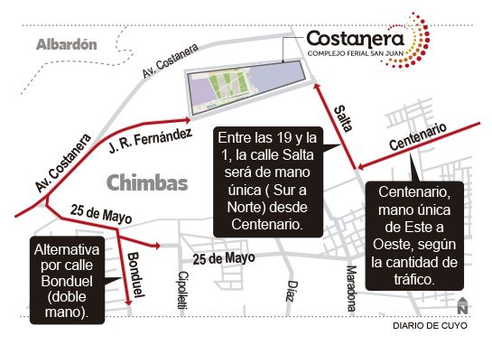 Desde las 19 sólo se puede transitar por Salta de Sur a Norte, para el ingreso, desde la avenida Centenario. También dispusieron semáforos intermitentes y personal policial. Este sentido de circulación cambia entre la 1 y la 1,30, cuando sólo se puede circular de Norte a Sur, para el egreso por calle Salta. El contratránsito es por calle Bonduel. En tanto, sobre la calle Centenario, se evalúa el cambio según el tráfico y la intensidad vehicular.