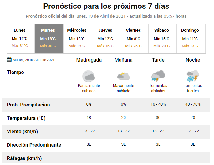 En cuanto al miércoles, también hay probabilidad de tormentas pero lo más destacado será la temperatura, que descenderá considerablemente. Para esa jornada se anuncian una mínima de 13 grados y una máxima de sólo 19 grados, 11 menos que durante la el día anterior.