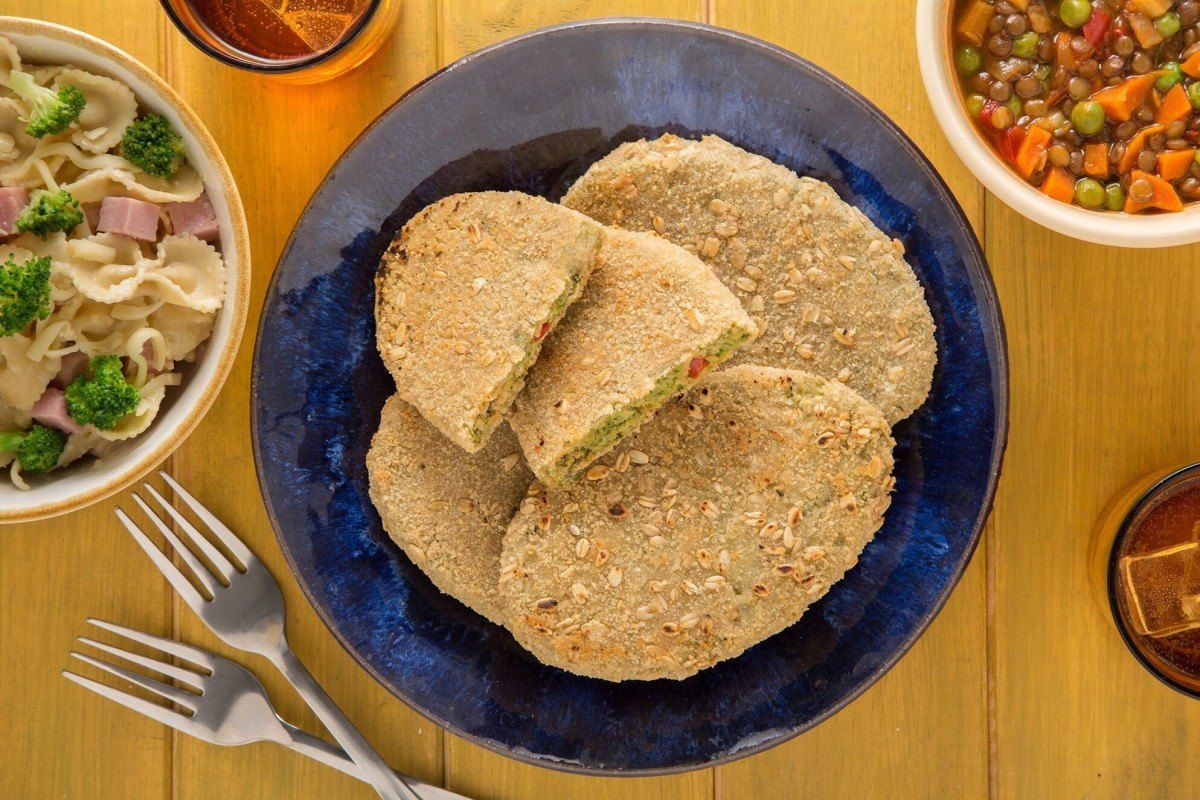 Ingredientes para 8 unidades: 1 taza de arroz cocido, 1 taza de lentejas cocidas, 3 cucharadas de queso rallado, 1/2 cebolla, 1/2 morrón rojo, 1 diente de ajo, 1 huevo, avena y semillas de chía c/n y una pizca de sal y pimienta.