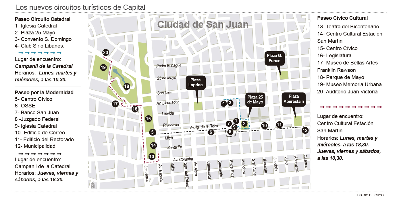 "La verdad que tuvimos poco tiempo para realizar estos circuitos debido a la pandemia y al aislamiento social obligatorio. Es por eso que queremos agregarles un plus. Estos paseos se realizan a pie y ahora queremos brindar la posibilidad de que la gente lo haga en bicicleta o monopatín", contó Mariano Graffigna. Mostrar el contenido cultural, histórico y turístico, como también la idiosincrasia y la actitud de superación del pueblo sanjuanino, fueron los principales factores que se tuvieron en cuenta para organizar y poner en marcha los tres nuevos circuitos por la ciudad.