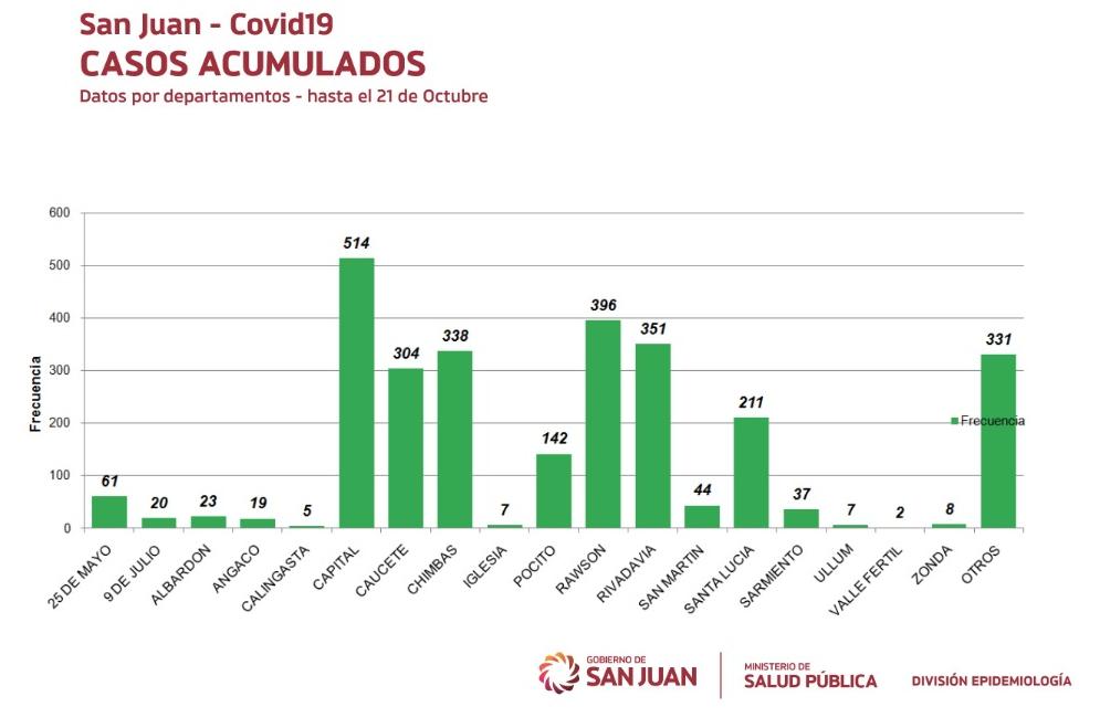 En la mañana de este viernes, el Ministerio de Salud de la provincia dio a conocer la distribución por departamento de los casos de coronavirus registrados en San Juan hasta anteayer, cuando había 2.820 (anoche la cifra alcanzó los 3.000 contagios). A través de los número se puede determinar que, Capital, con 514 casos; y Rawson, con 396; concentran un tercio del total de contagios en la provincia.