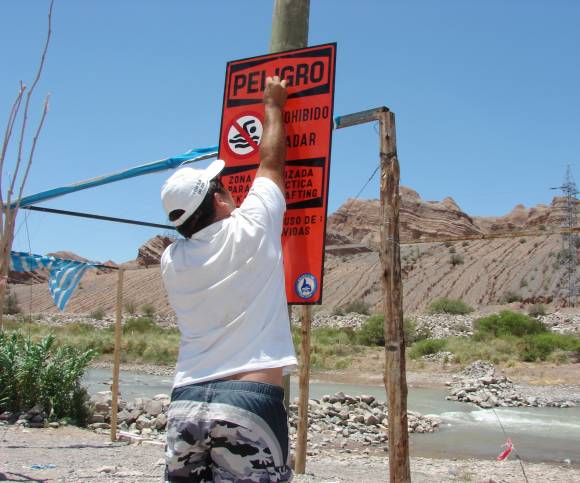 El Kayak Club San Juan colocó carteles de señalización que indican que está prohibido nadar en esa zona del río San Juan, bajo el paredón del Dique de Ullum, donde se construyó la ola artificial para practicar kayak. Fue en cumplimiento de un requerimiento de Rivadavia.