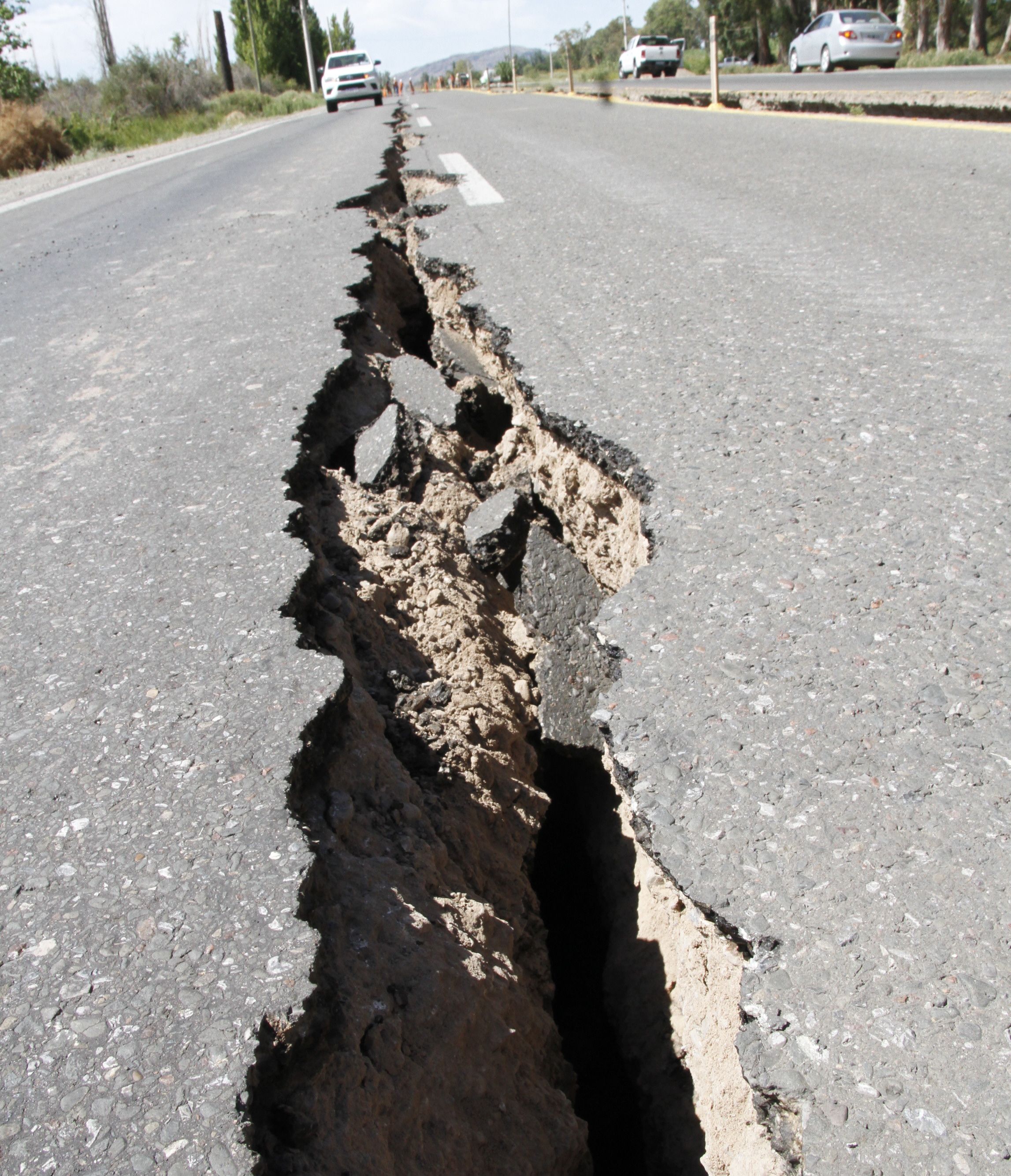 Impresionante. Según Vialidad Nacional, la grieta que se abrió en la Ruta 40, a la altura de Pocito, tiene una extensión de 4 kilómetros, unos 30 centímetros de ancho y 3 metros de profundidad en varios tramos.