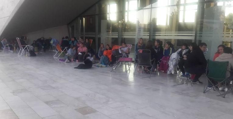 Cubriendo turnos, las chicas esperan desde el domingo al mediodía la apertura de las boleterías del Teatro del Bicentenario en las que se venderá las entradas para los distintos shows que se presentarán en la Feria de la Fiesta Nacional del Sol 2019.