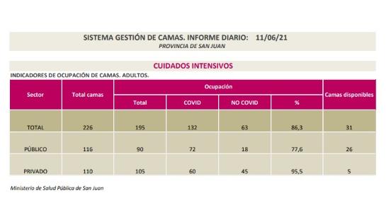Se encuentran internados 277 pacientes en las áreas de COVID-19 (entre positivos y sospechosos) de los hospitales Dr. Guillermo Rawson; Dr. Marcial Quiroga; Dr. Ventura Lloveras, de Sarmiento; Dr. César Aguilar, de Caucete; Dr. José Giordano, de Albardón; Dr. Federico Cantoni, de Pocito; CEMEC; Dra. Julieta Lanteri; Hospital San Roque, de Jáchal; Hospital Dr. Alejandro Albarracín, de Valle Fértil; Hospital de Barreal, de Calingasta; Hospital Privado; Instituto Médico; Clínica El Castaño; Clínica Santa Clara; Sanatorio San Juan y CCI.