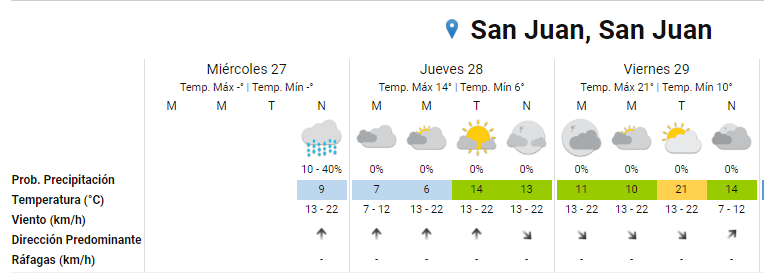 El Servicio Meteorológico Nacional indica en su pronóstico para San Juan que el jueves se presentará con condiciones similares a la de las ocurridas este miércoles, aunque con el dato que la siesta será un poco más cálida ya que está prevista una temperatura máxima de 14 grados para Capital y alrededores,mientras que el registro máximo de este miércoles fue de 10,4 grados.