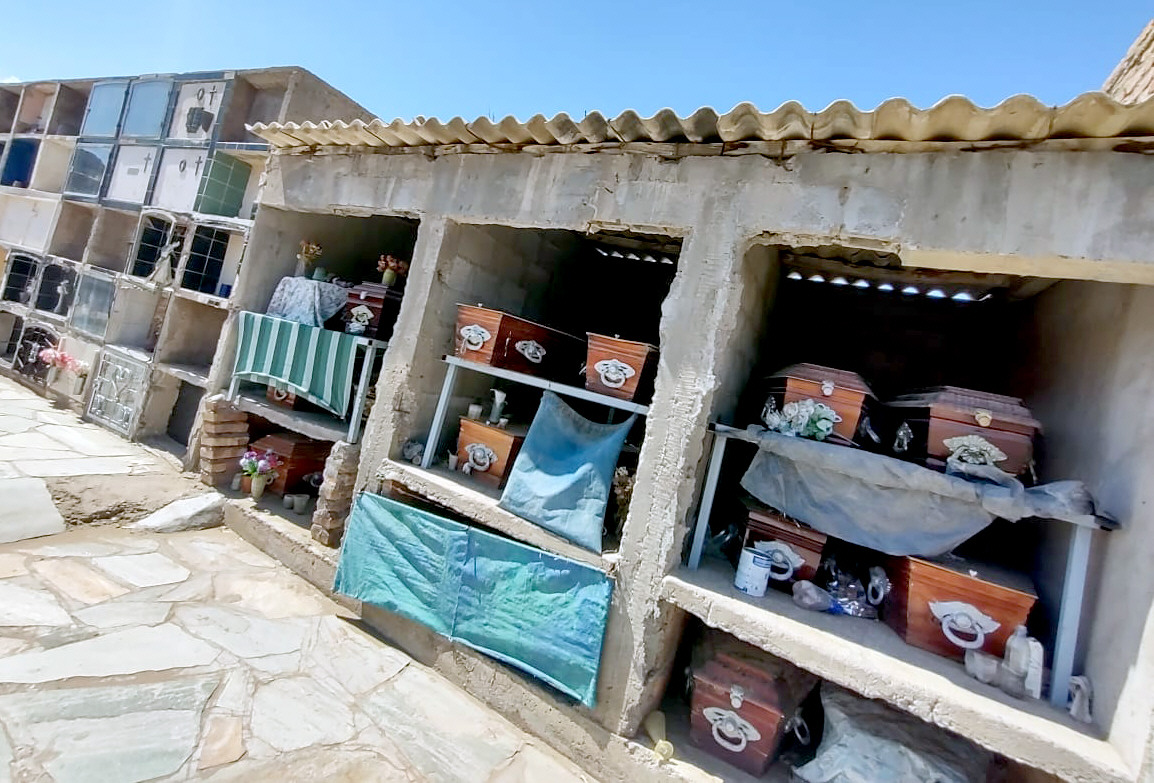 El predio termina donde comienza a elevarse la tierra para convertirse en cerro. Ahí, los nichos tienen techos de chapa, están separados por estructuras metálicas que parecen ser caseras y muchos tienen escrito con tizas de colores el nombre de los muertos. Desde el municipio dijeron que esos son depósitos.