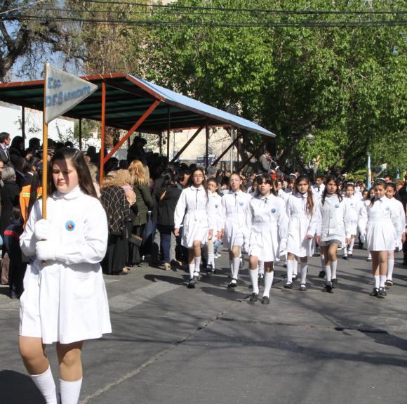 A las 11, los alumnos comenzaron a pasar por el palco principal apostado en Libertador y Sarmiento. Primero pasaron los chicos del Nivel Inicial, luego lo hicieron los que van a la Primaria y cerraron la columna los del Secundario. Unos 40 minutos tardaron en pasar por el lugar que estuvo vallado para contener al público. A diferencia de otros desfiles, no participaron los vehículos del Ejército. Sí lo hicieron los distintos destacamentos del DIM22 y de la Policía de San Juan.
