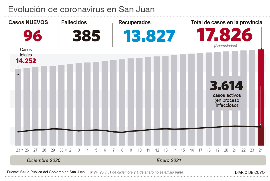 Distinto fue el comportamiento de la curva de muertes en San Juan a causa de la pandemia. En lo que va de enero se incrementó semana a semana ese índice: 14 personas fallecieron en la semana del 4 al 10 de enero, 17 murieron entre el 11 y el 17 de enero, y 18 personas fallecidas hubo desde el lunes 18 (contando las 2 personas de ayer inclusive, dos mujeres de 72 y 79 años, de Chimbas y Rawson respectivamente). Por otro lado, anoche seguían internados 90 pacientes en Áreas Covid y 54 de ellos permanecían en Área Crítica. De ese grupo, 24 seguían con asistencia respiratoria mecánica.