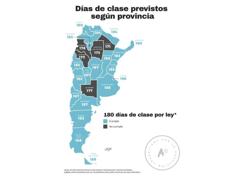 De acuerdo con el relevamiento, la suma de feriados nacionales, provinciales y vacaciones les impide a esas cinco provincias alcanzar el objetivo que exige la normativa vigente.