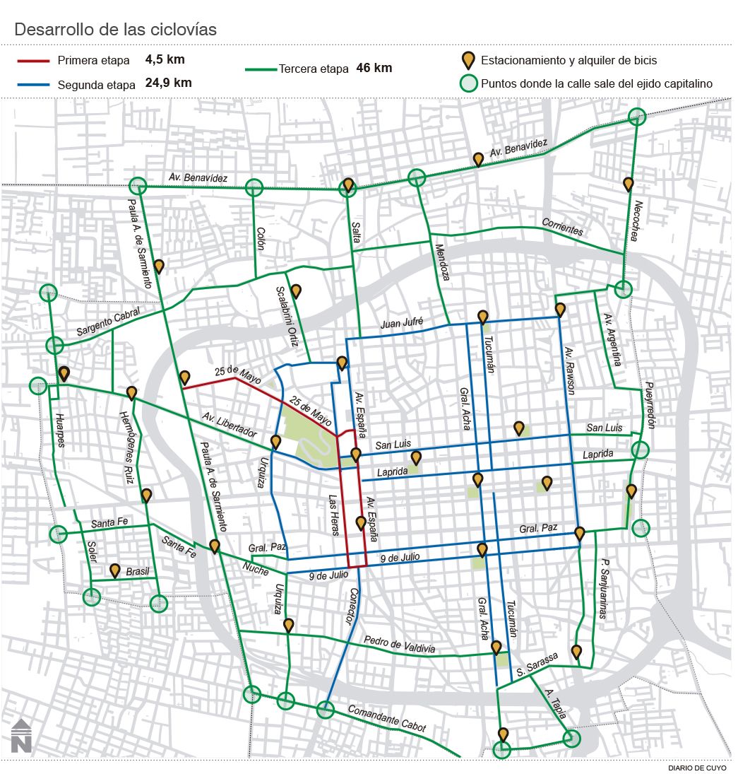 Con un circuito que comprenderá 25 de Mayo, desde Paula A. de Sarmiento, España (hasta 9 de Julio) y Las Heras (de regreso a 25 de Mayo), comenzará la primera de 3 etapas para incorporar en Capital una red de ciclovías que, al culminar el proceso, tendrá 75,4 kilómetros, impactando de lleno en la cultura vial.