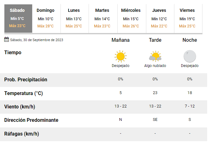 La jornada se presentará con una máxima de 23 grados y una mínima de 5°C, con cielo de despejado en la mañana a algo nublado por la tarde. El viento prevalecerá del norte en la mañana, rotará al sudeste por la tarde y girará al sur por la noche.