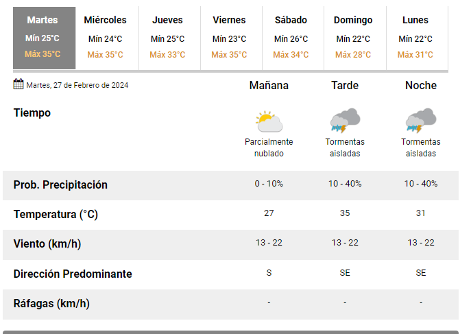 Según el Servicio Meteorológico Nacional, para este martes 27 de febrero las temperaturas serán cálidas y habrá un cambio en la noche. En este sentido, detallaron que la máxima trepará hasta los 35°C mientras que la mínima caerá hasta los 25°C.