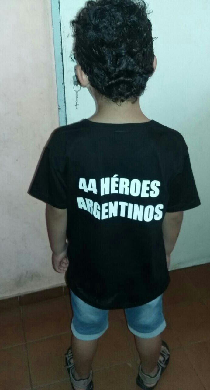 Desde muy chiquito, Jorge Ismael Villafañe, a quien sus familiares llaman Coco, escuchó de boca de su madre la importancia de la gesta que llevaron adelante los soldados en las Islas Malvinas. Hoy, con 7 años, es fanático de los soldados y aprende todo lo que puede sobre el tema. Por eso, le llamó la atención la desaparición del ARA San Juan y cuando su madre le explicó de qué se trataba decidió pedir un deseo: que le hiciera una remera en homenaje a los 44 tripulantes. Ahora, la luce contento.