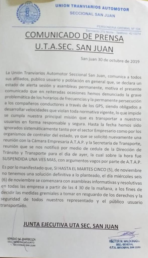 Con el objetivo de llevar esta problemática al sector empresario y el organismo de control se solicitó una reunión que finalmente no se concretó y desató el ultimátum del gremio. “Si hasta el martes 5 de noviembre no tenemos una solución definitiva a lo planteado, el miércoles se comenzará con asambleas informativas y resolutivas en todas las empresas desde las 4.30 de la mañana con la intención de definir las medidas a seguir”, concluye el comunicado.