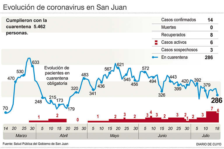 El Ministerio de Salud Pública informó ayer que el casillero de recuperados de coronavirus tiene un nuevo tilde. Se trata del caso número 8, un transportista que se mantuvo asintomático pero necesitó de 27 días para que una nueva PCR de control diera negativa. Así, en San Juan son contabilizados 14 casos, de los cuales 6 permanecen con proceso infeccioso. A su vez, hay 3 diagnósticos sospechosos.