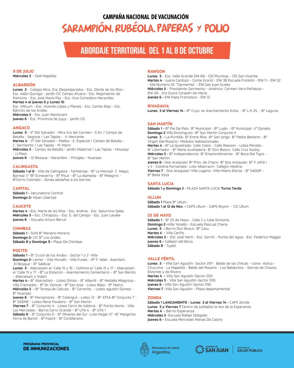 Desde el Ministerio de Salud de la provincia, informaron que, la inmunización es obligatoria y gratuita y se extenderá hasta el 13 de noviembre en todos los centros de vacunación, los hospitales que posean vacunatorios. Incluso, el jefe del Programa de Inmunizaciones, Fabio Muñoz, indicó que recorrerán las viviendas para colocar las dosis.