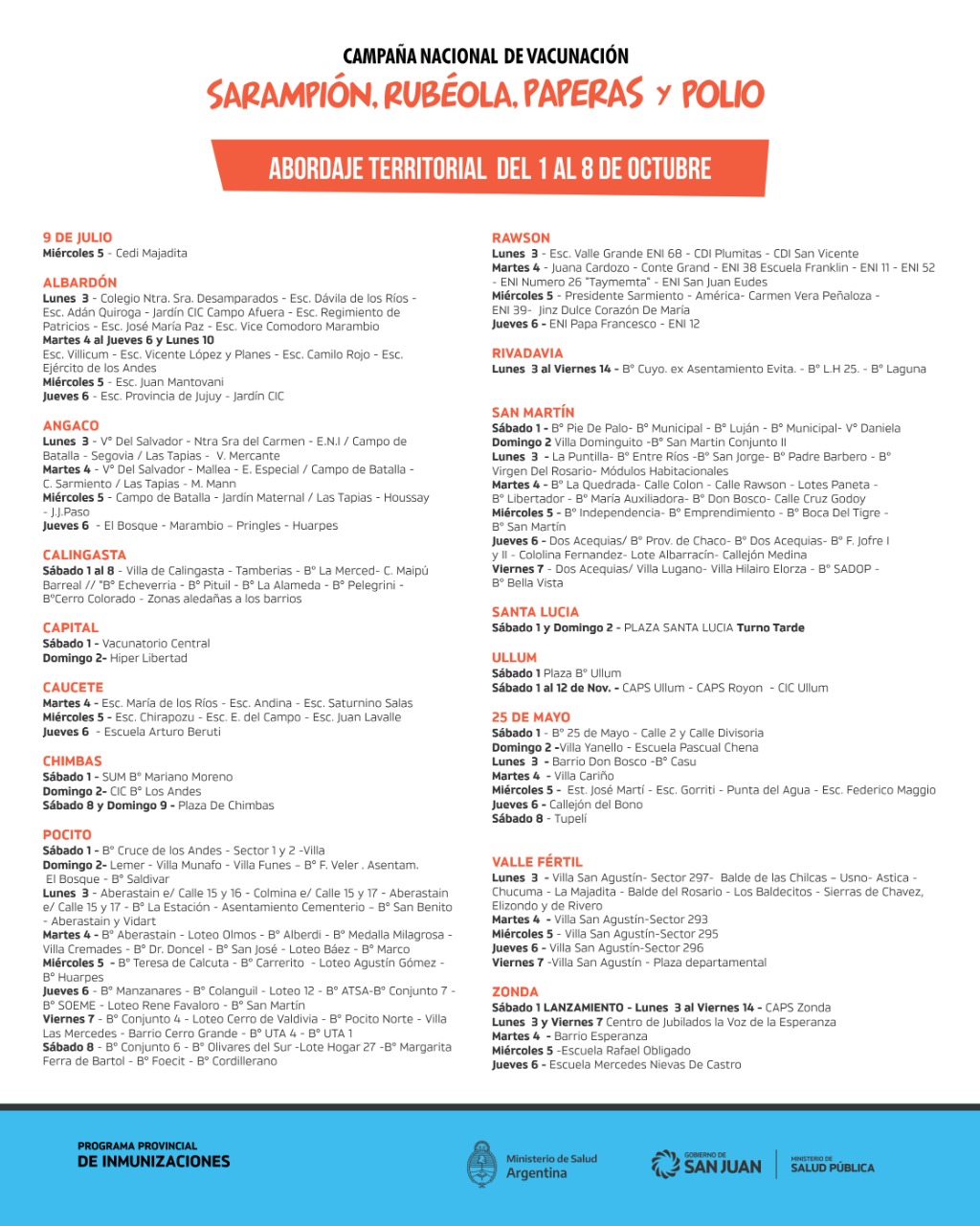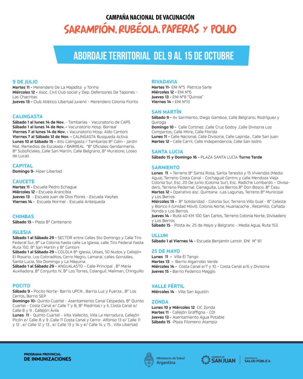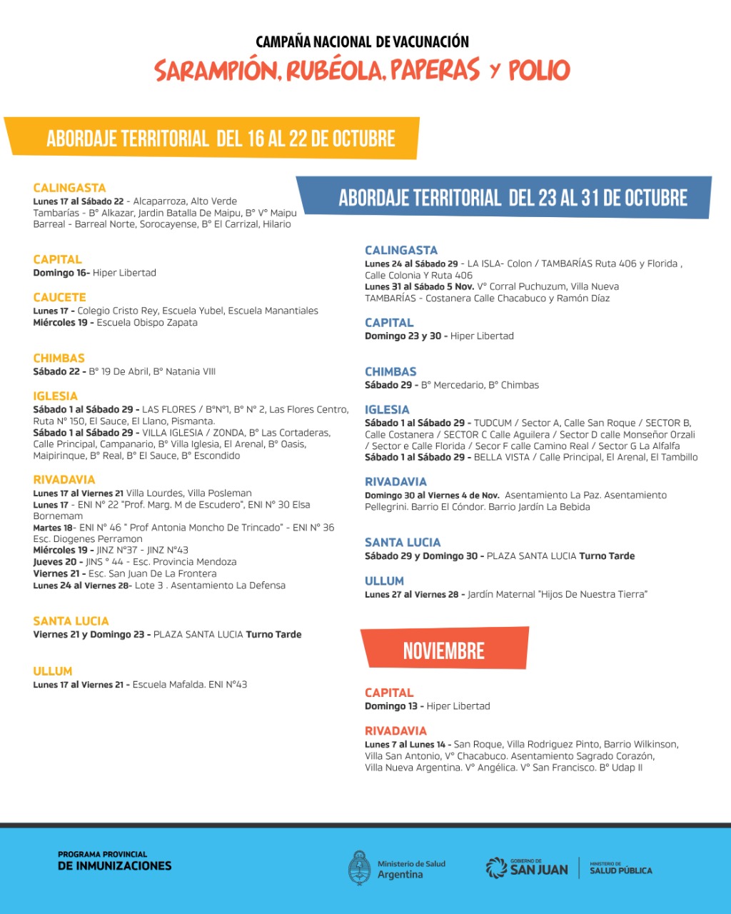 Desde el Ministerio de Salud de la provincia, informaron que, la inmunización es obligatoria y gratuita y se extenderá hasta el 13 de noviembre en todos los centros de vacunación, los hospitales que posean vacunatorios. Incluso, el jefe del Programa de Inmunizaciones, Fabio Muñoz, indicó que recorrerán las viviendas para colocar las dosis.