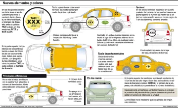 Los taxis seguirán siendo amarillos y blancos y llevarán el número de licencia en las puertas delanteras y en el baúl. No llevarán la baliza que indicaba que eran taxis, y en cambio, tendrán en el parabrisas, una visera de color amarillo, en la que deberá estar escrita la palabra Taxi y el número de licencia. Además, en las puertas trasera deberá estar el nombre de la empresa a la que pertenece.