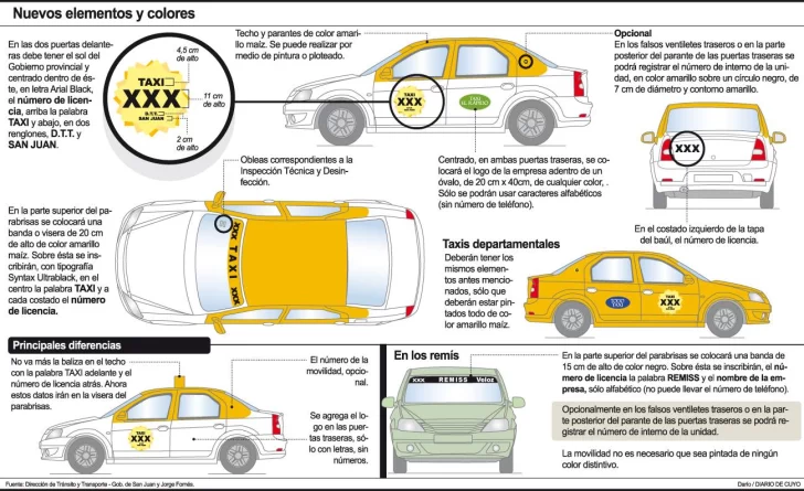 Según la nueva reglamentación de Tránsito y Transporte, a partir del 1 de diciembre, los taxis y remises lucirán de manera diferente. Víctor Ibáñez, director de Tránsito dijo que el objetivo es unificar los vehículos y que los usuarios los puedan distinguir con facilidad. Uno de los principales cambios en los taxis será que dejarán de usar la baliza que llevaban en el techo, mientras que los remises no podrán llevar el número de teléfono inscripto.