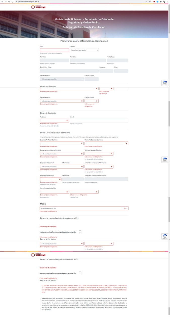 Los datos deben completarse en la página https://permisocirculacion.sanjuan.gob.ar/ donde se despliega el siguiente formulario que hace las veces de declaración jurada:
