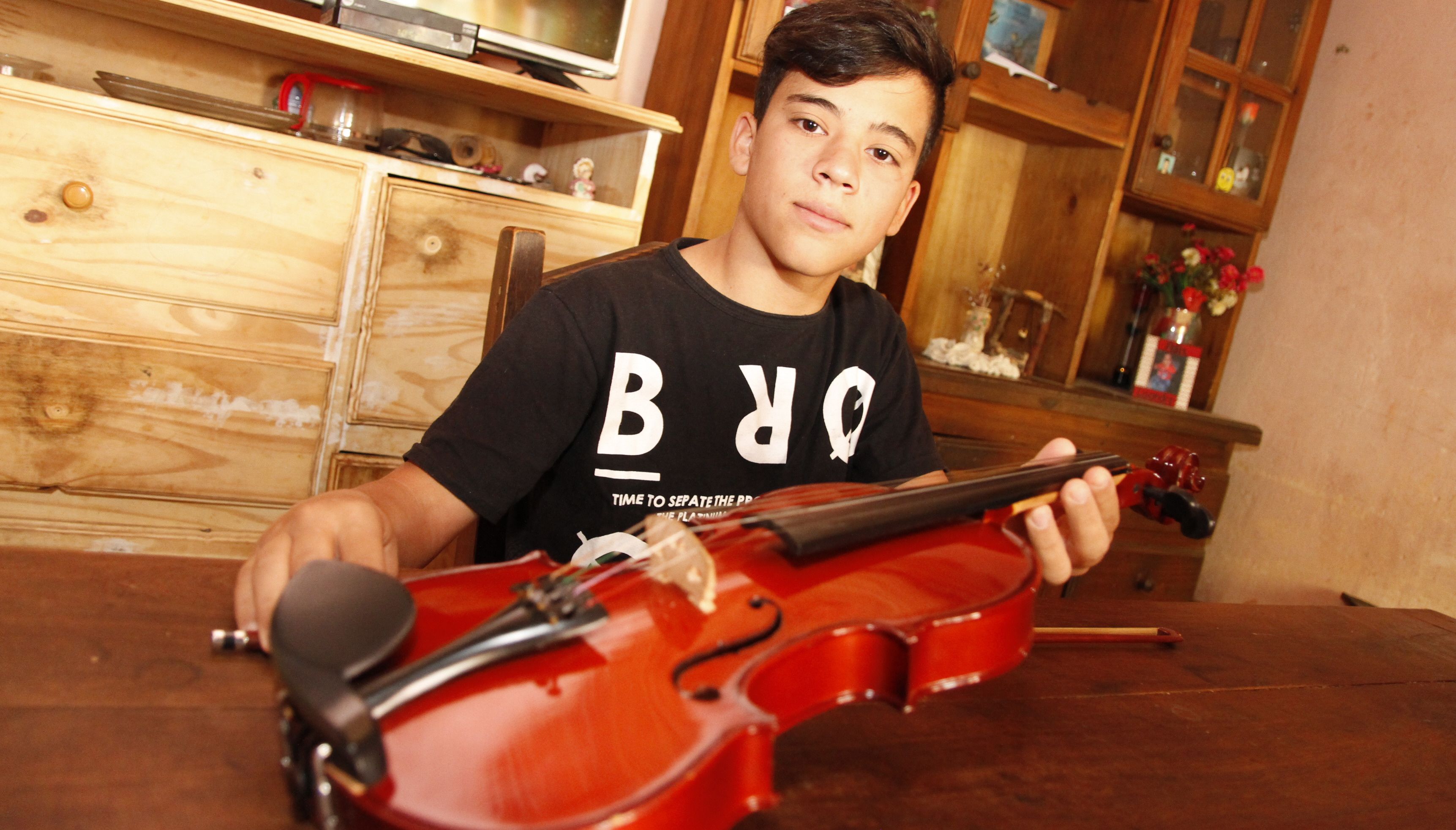 Su habitación con techo de caña y paredes con huellas de humedad es una especie de búnker donde lo único que importa es colocar bien la mano y que cada nota suene afinada. Toma el violín, lo acomoda sobre el hombro y su mirada parece perderse. Sin embargo, ese es el instante de mayor concentración, disciplina y felicidad para Matías, de 16 años, que con mucho esfuerzo aprendió a tocar el instrumento. Juntando moneditas que le daban las señoras que salían del supermercado porque él les ayudaba a llevar los carritos y las bolsas de la mercadería, pudo comprar su primer instrumento. Ahora, Matías dice que aprender a tocar el violín le cambió la vida por completo. Forma parte de la Orquesta Escuela San Juan.