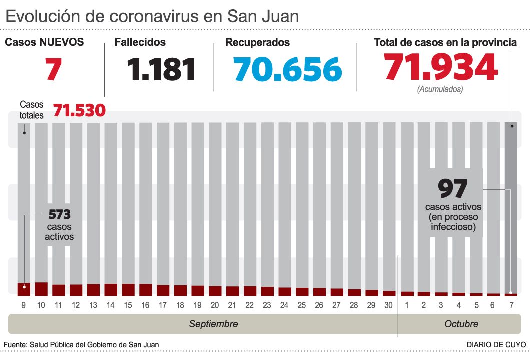 Salud Pública comunicó ayer que hubo 7 nuevos casos de covid y el acumulado ahora es de 71.934. De todos ellos, hay apenas 97 casos activos, por lo tanto San Juan bajó ayer la barrera del centenar de personas enfermas. Además, hay 51 internados. En tanto, no hubo decesos por cuarto día consecutivo.