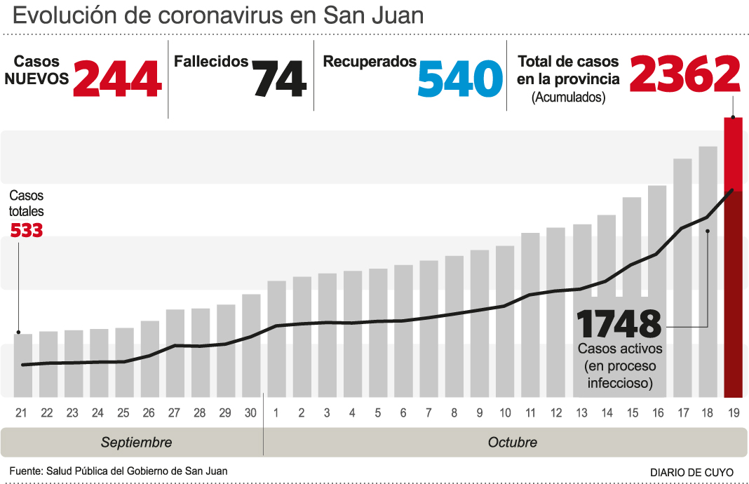 A exactamente dos meses desde que realizaron el primer bloqueo a un barrio de Caucete, aquel brote derivó ayer en la declaración de circulación viral comunitaria en todo el territorio provincial. El Ministerio de Salud Pública hizo el anuncio tras una escalada de casos que acumula 2.362 positivos; un panorama totalmente diferente a aquel 19 de agosto cuando San Juan ostentaba apenas 22 positivos y sólo uno activo. Frente a la nueva situación sanitaria, las autoridades informaron que reforzarán los testeos con la habilitación de 17 centros en total (hasta la semana pasada eran 11); a la vez que descartaron volver a Fase 1 por ahora.