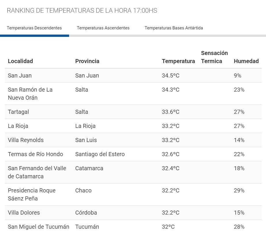 A las 17 el termómetro llegó a los 34.5 grados apenas por encima de lo que a la misma hora se registraba en la localidad salteña de San Ramón de La Nueva Orán, segunda en el ranking elaborado por el SMN.