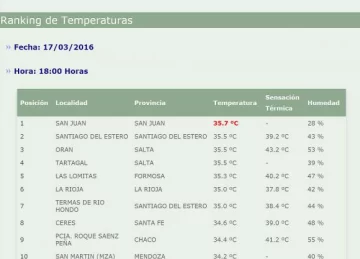 A esa hora, el termómetro en la provincia alcanzó los 35,7° alcanzando así la cima del ranking realizado por el Servicio Meteorológico Nacional. Pero esa temperatura no fue la más alta registrada en la jornada, ya que a las 17, la temperatura alcanzó los 36,2°.