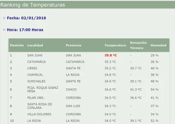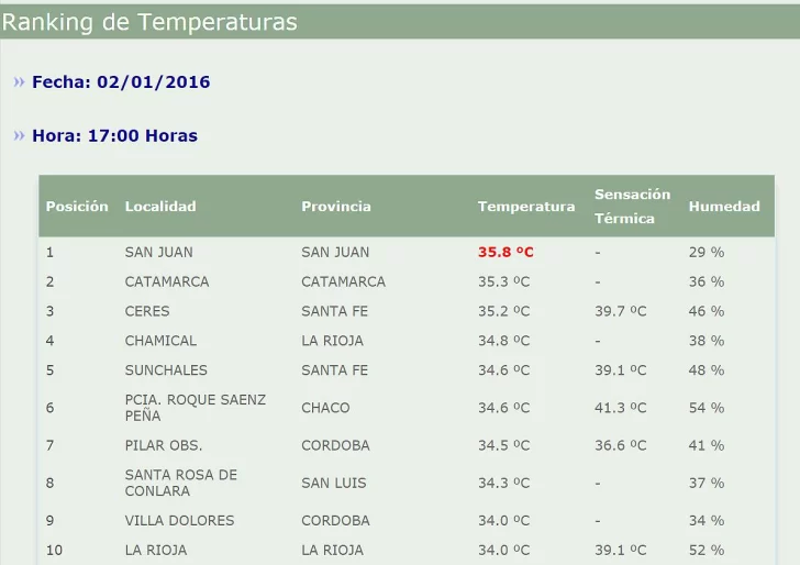 San Juan.- Nuevamente la provincia lidera el ranking nacional de temperatura al llegar a los 35,8° a las 17, siendo la temperatura más alta de la jornada en un día que la máxima prevista estaba cercana a los 39°.