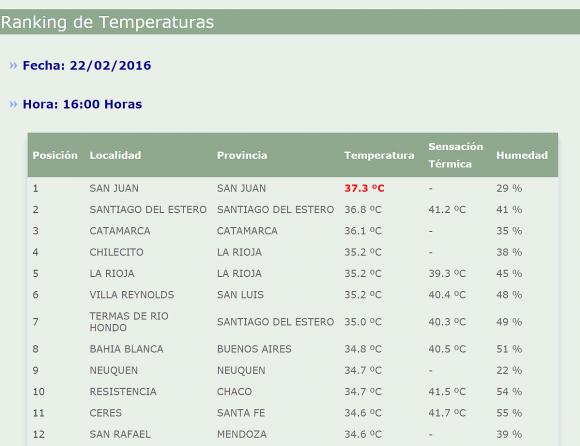 Según el ranking de temperaturas de la entidad nacional, San Juan registró las 16 un temperatura de 37,3° siendo así la provincia más calurosa del país para esa hora.