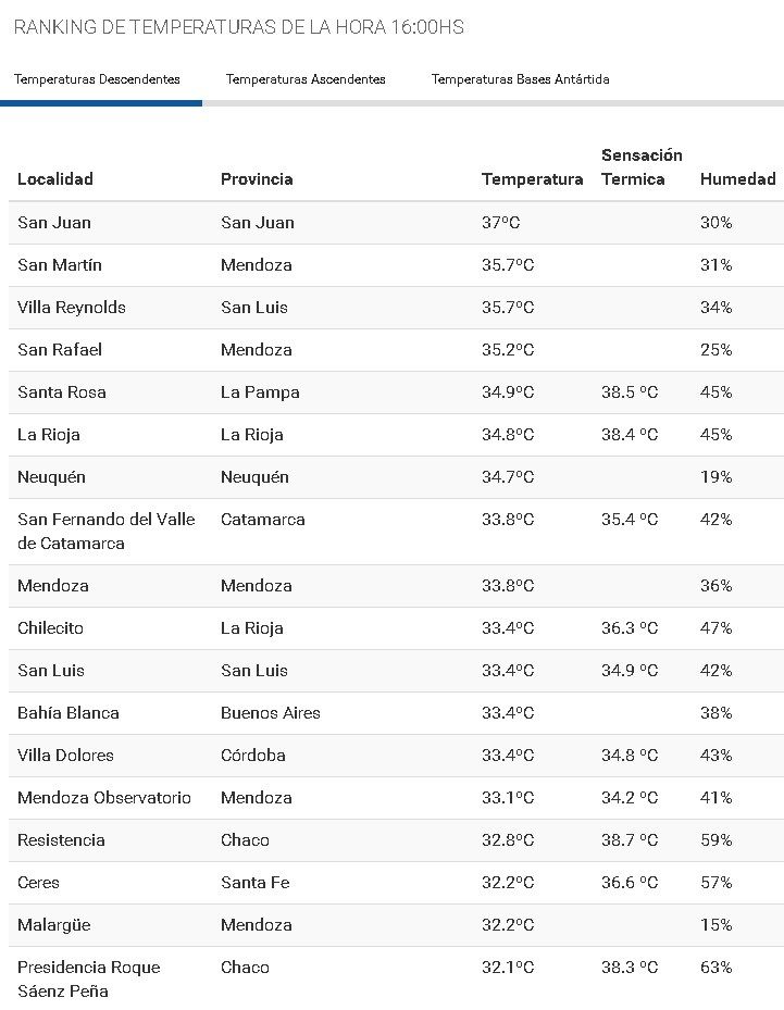 Tal cual se esperaba, San Juan se convirtió una vez más en la provincia más caliente del país. El termómetro marcó 37 grados a las 16 y se mantuvo, para encabezar el ranking de temperaturas del Servicio Meteorológico Nacional.