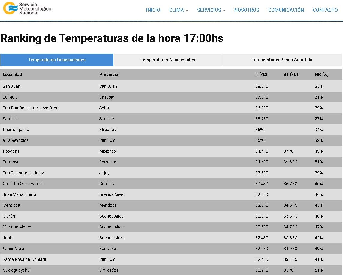 Según informó el Servicio Meteorológico Nacional, la provincia registró 38,8 grados y un 25% de humedad, seguida de La Rioja (37,8º) y Salta (36,9º).