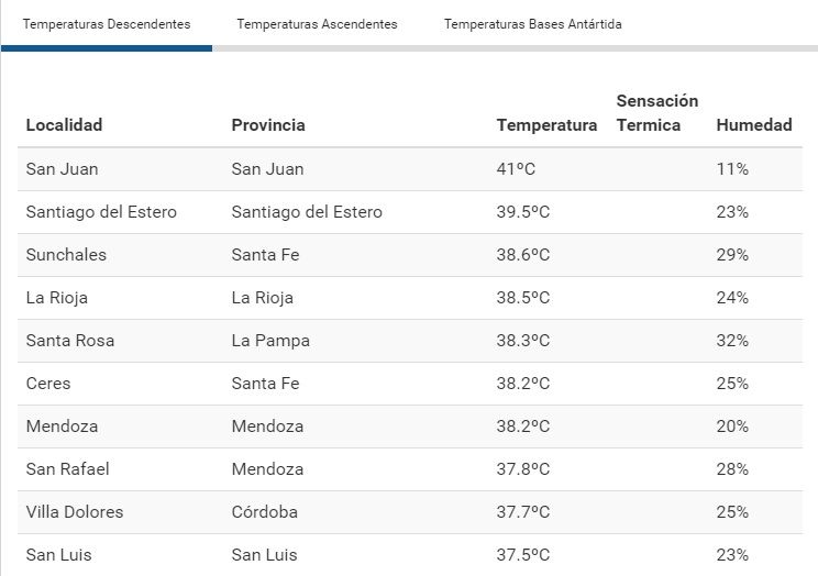 De esta manera, San Juan se convirtió en la ciudad más calurosa del país, seguida de Santiago del Estero con 39,5°C y en tercera posición se ubicó la localidad de Sunchales, de Santa Fe, con 38,6°C.