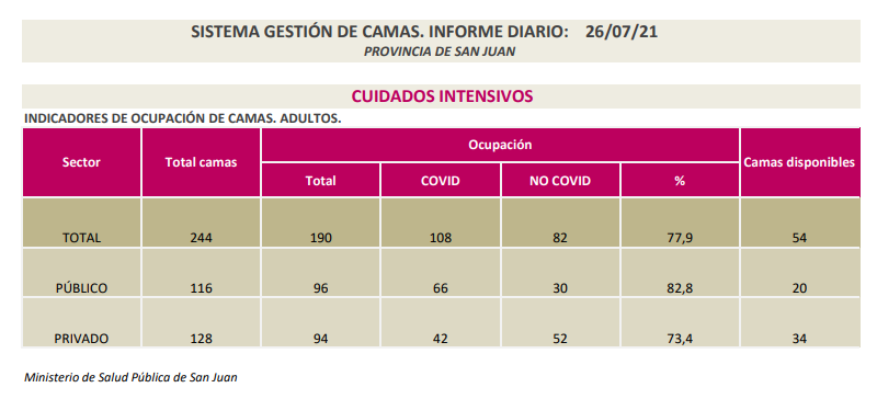 Además, se encuentran internados 205 pacientes en las áreas de COVID-19 (entre positivos y sospechosos) de los hospitales Dr. Guillermo Rawson; Dr. Marcial Quiroga; Dr. Ventura Lloveras, de Sarmiento; Dr. César Aguilar, de Caucete; Dr. José Giordano, de Albardón; Dr. Federico Cantoni, de Pocito; CEMEC; Dra. Julieta Lanteri; Hospital San Roque, de Jáchal; Hospital Dr. Alejandro Albarracín, de Valle Fértil; Hospital de Barreal, de Calingasta; Hospital Privado; Instituto Médico; Clínica El Castaño; Clínica Santa Clara; Sanatorio San Juan y CCI.