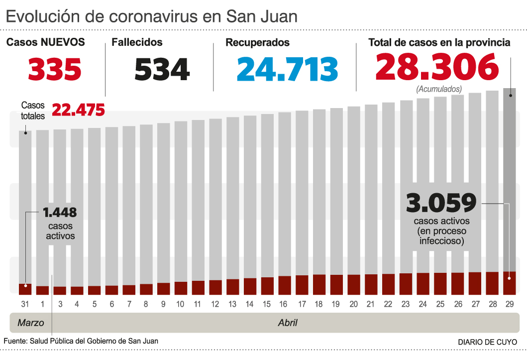 Salud Pública informó ayer 335 nuevos casos, la cifra más alta del año, y el acumulado de infectados asciende ahora a 28.306. De ellos, hay 3.059 casos activos y los internados ya son 189; de los cuales 93 permanecen en área crítica (43 se encuentran con asistencia respiratoria mecánica).