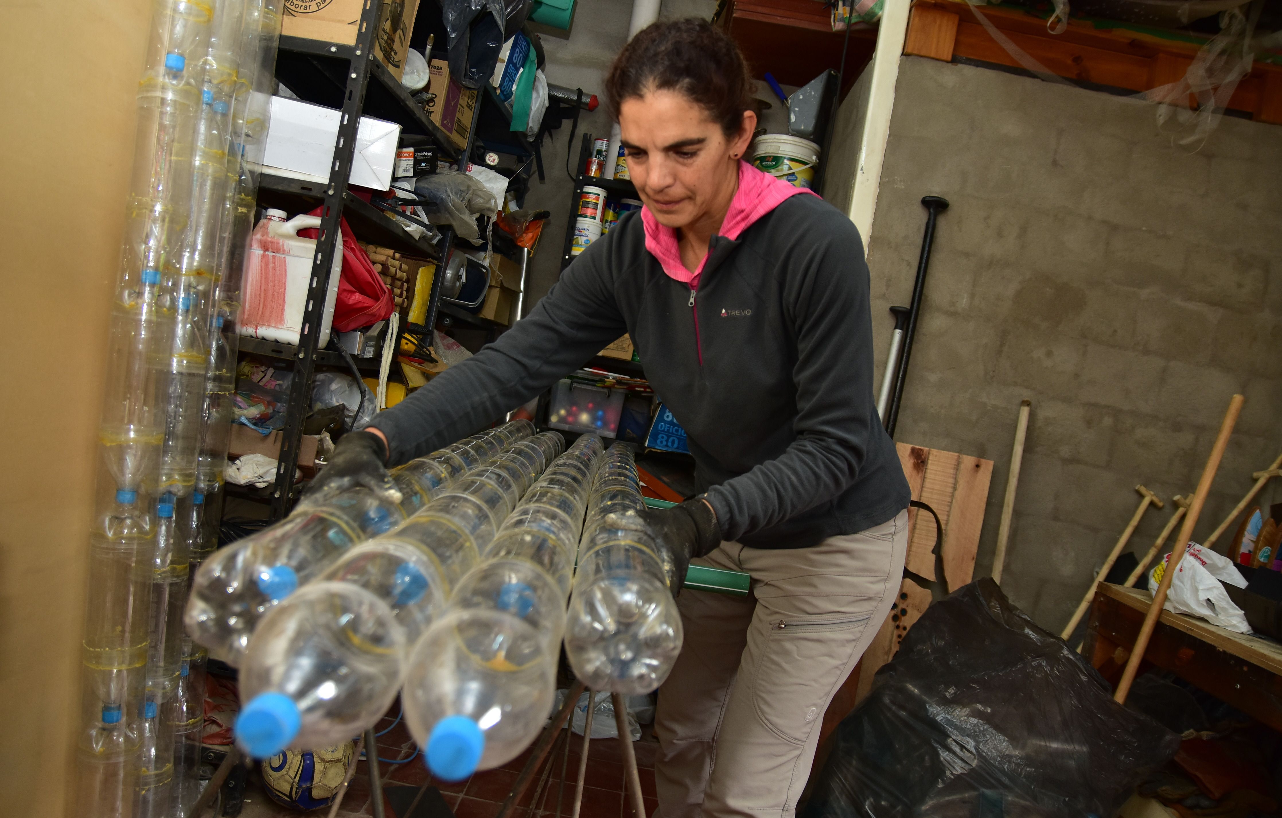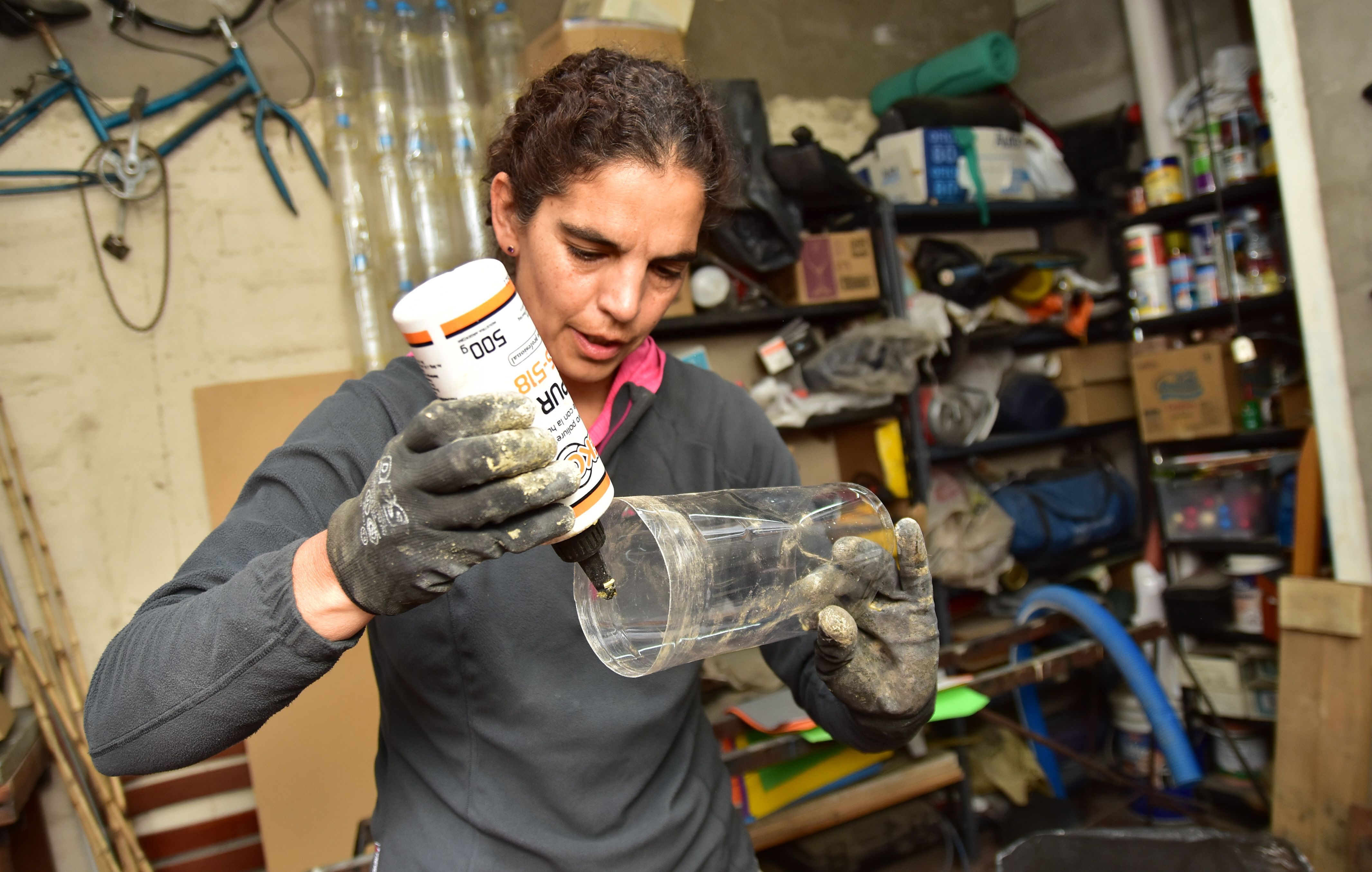 Una vez que Lilia recolectó y seleccionó las botellas, que deben ser idénticas y totalmente lisas, las lija para hacer más áspera la superficie a adherir. Antes de colocar el pegamento, que tuvo que traer del exterior, infla cada botella mediante el aire de un compresor.