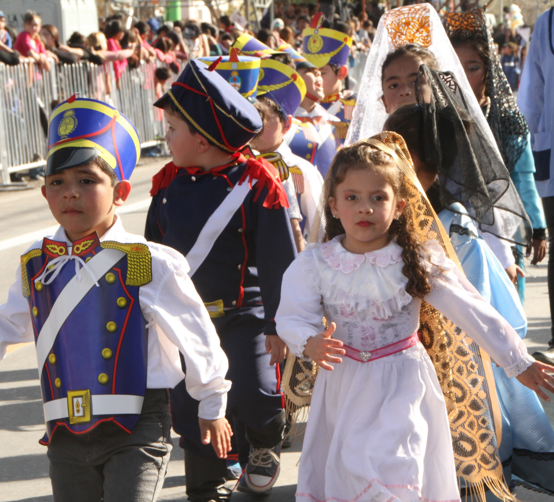 Pero esa escena no fue la única temática que hubo a lo largo del desfile. Los alumnos de Nivel Inicial también aportaron patriotismo y le rindieron honor al general. Todos los varones desfilaron caracterizados de Granaderos, mientras que las nenas representaron a las Patricias Sanjuaninas, cosechando también la ovación popular.