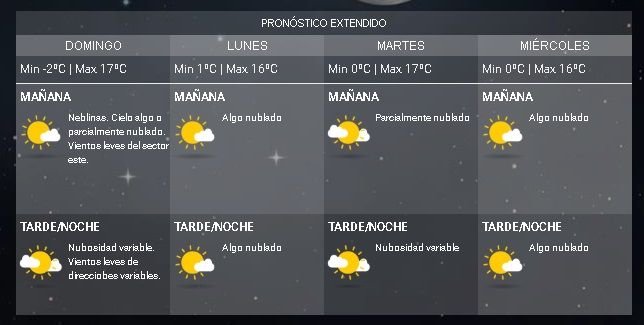 Con máximas que oscilarán entre los 16 y 17 grados, así se despide julio. De esta manera, el Servicio Meteorológico Nacional informa que para este domingo la máxima será de 17ºC mientras que la mínima será de -2ºC.