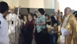 San Juan, 30 de marzo.- Pasadas las 21, comenzó el primero de los ritos de la Vigilia de Pascuas en la Catdral. Con la presencia de cientos de fieles, Monseñor Alfonso Delgado acompañado por el Padre Rómulo, bendijo el fuego que se encontraba en un pequeña fogata realizada en el atrio del templo y el cirio baustismal que estará presente en cada ceremonia que se haga en la Iglesia San Juan Bautista.