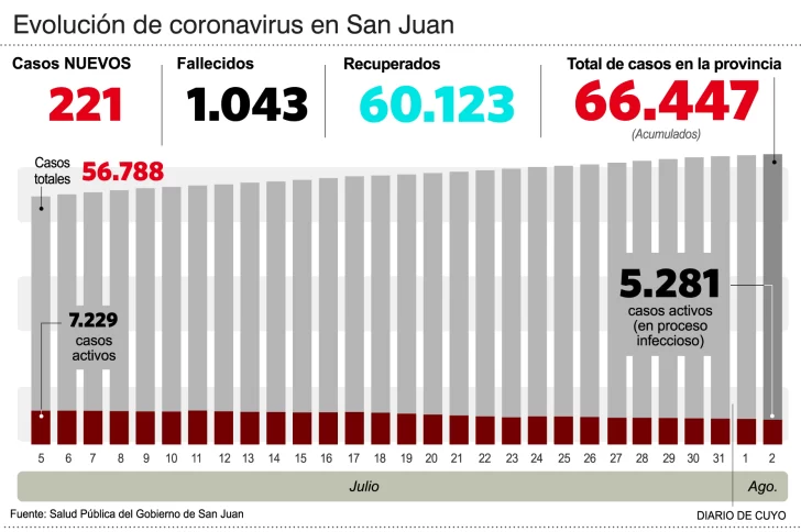 Por otro lado, la mirada sobre los casos activos también manifiesta una merma. Mientras que a fines de mayo había 8.451 pacientes con infección en curso, el cierre de junio mostró 7.654 y la despedida de julio fue con 5.498. Ayer, en tanto, reportaron 5.281.